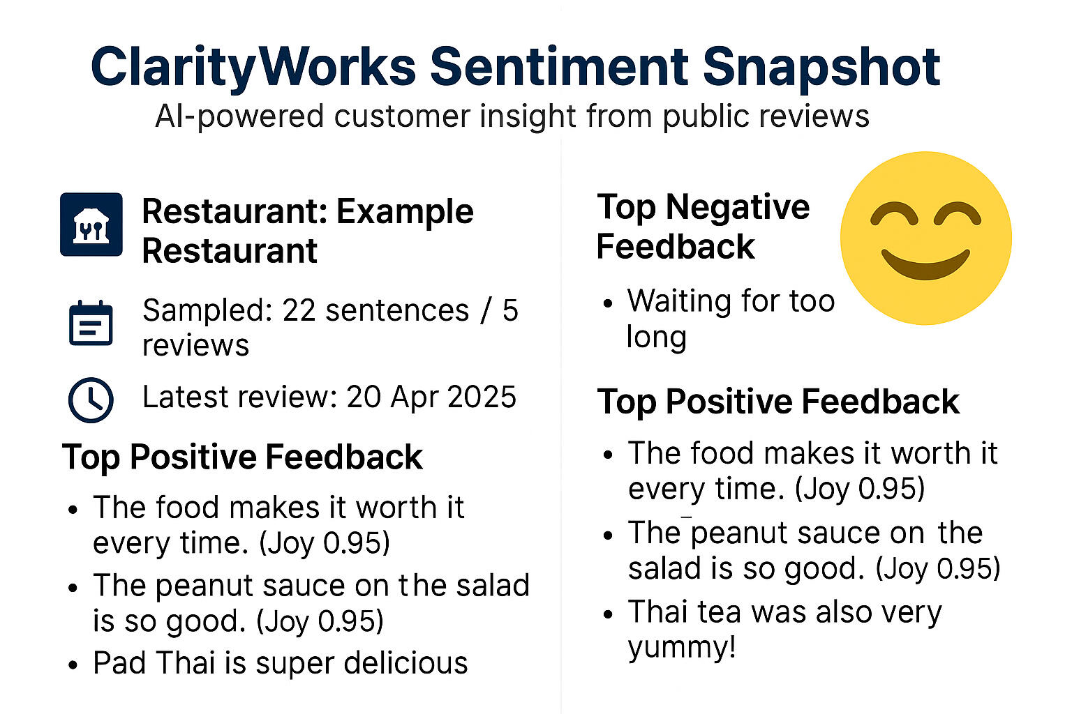 Understanding how your customers truly feel can transform your business. With ClarityWorks, you can spot hidden problems before they damage your reputation, turn glowing reviews into powerful marketing content, and save countless hours by letting our AI do the heavy reading for you.